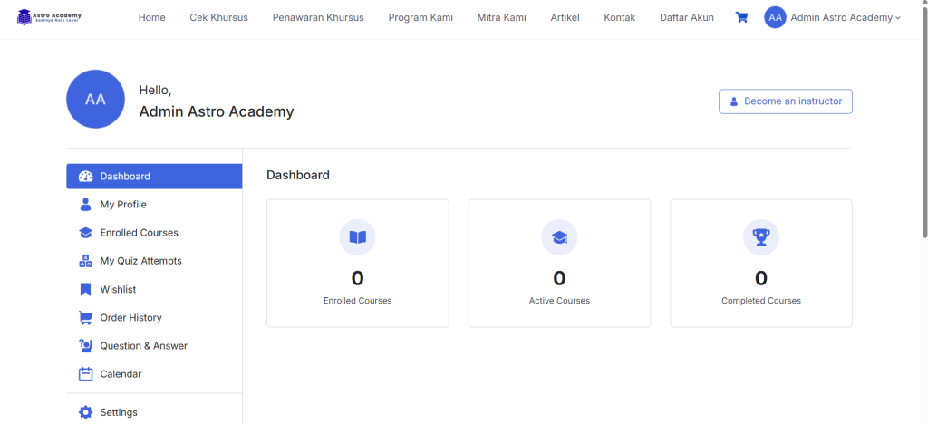 6. Setelah Berhasil Login, Anda akan langsung diarahkan ke Dashboard Akun Astro Academy.